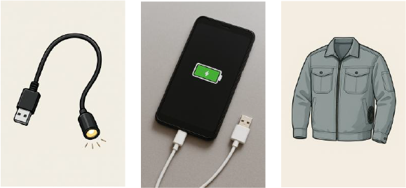 ライト等への給電、スマートフォンや空調服のバッテリー充電など様々な機器で利用可能です。
